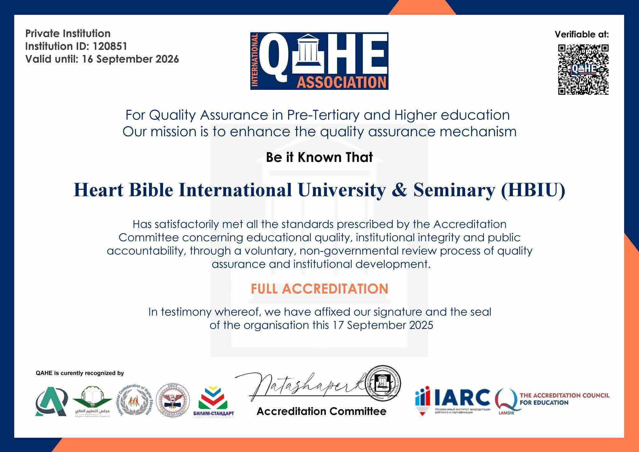 ​HBIU / Heart Christian University Disclaimer Statement: Our courses meet the requirements established by many private, independent Christian, and professional associations. Various regionally or nationally accredited Christian Universities, colleges, and seminaries throughout the United States may accept transfer students, credits, and degrees from other Institutions.